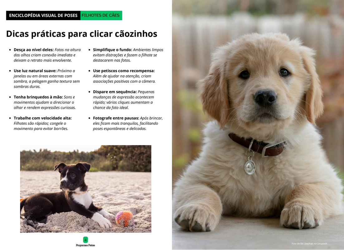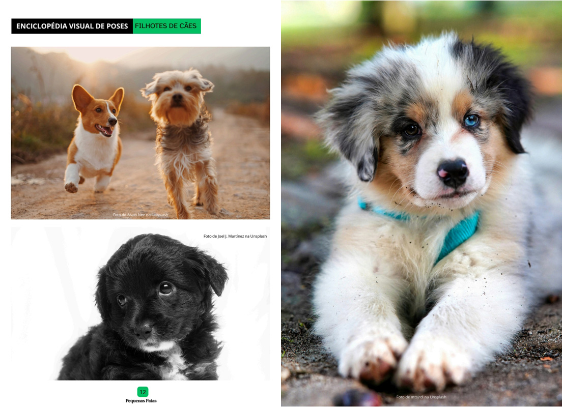 A coleção Pequenas Patas – Enciclopédia Visual de Poses reúne os volumes Filhotes de Cães e Filhotes de Gatos em uma proposta voltada ao registro fotográfico dos primeiros meses de vida de animais domésticos. A série apresenta imagens organizadas por ações, gestos e situações do cotidiano, permitindo observar postura, equilíbrio, movimento e interação com o ambiente. Cada livro estrutura o conteúdo de forma temática, traz mais de 50 fotos diferentes, facilitando a consulta e a análise de detalhes corporais, posições das patas, direção do olhar e formas de exploração do espaço.