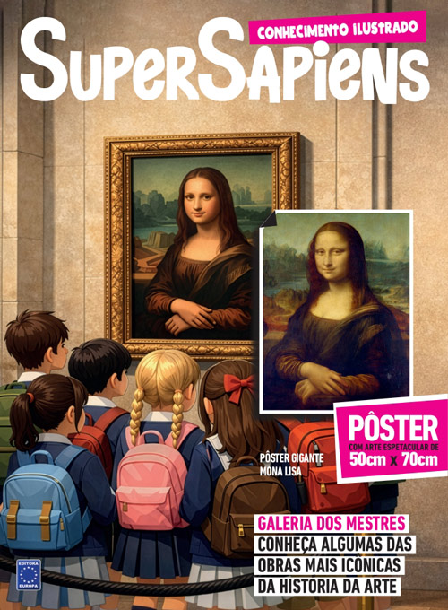 Edição especial em formato pôster da SuperSapiens com a Galeria dos Mestres: a história e informações de algumas das obras mais icônicas da história da arte. De um lado informações e curiosidades, do outra arte ampliada em formato 50 x 70 cm de uma grande obra de arte, para usar na escola, em casa, como decoração ou aprendizado! Nesta edição acompanha arte gigante de "Mona Lisa" de Leonardo da Vinci.