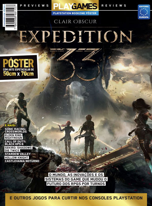 A revista PlayGames Posterzine apresenta uma edição dedicada ao universo do game Clair Obscur: Expedition 33 A edição acompanha um pôster de 50 cm x 70 cm com arte temática do jogo. Além da cobertura aprofundada de Expedition 33, a revista também traz prévias e análises de outros títulos de destaque. Entre eles estão Sonic Racing: Crossworlds, Elden Ring: Nightreign, Call of Duty: Black Ops 6, Sekiro: Shadows Die Twice, Stardew Valley, Hollow Knight e Castlevania Noturno. O conteúdo é voltado para quem busca atualizações, estratégias e informações sobre os lançamentos mais recentes e aguardados dos consoles Playstation.