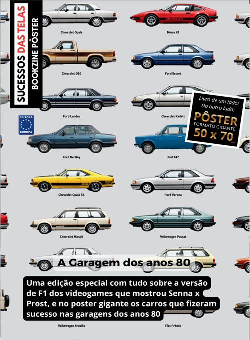 Edição especial em formato posterzine, com pôster gigante incluindo cinquenta carros que fizeram história nos anos 80 em versão miniatura.Formato gigante em 50x70 cm para ver, decorar e aprender. No verso reportange com a versão de F1 que retratou nos videogames a rivalidade entre Senna e Prost.