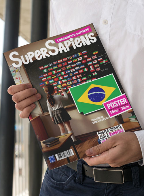 Bandeira do Brasil em formato 50x70cm em edição especial da Supersapiens Posterzine com bandeiras do mundo inteiro. Impressa em formato gigante e papel de alta gramatura. Para aprender, decorar, torcer e honrar o país.